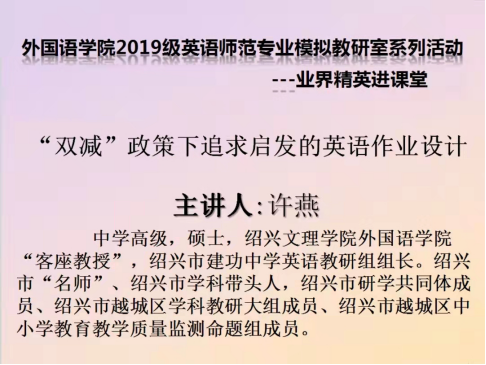 3月10日下午,绍兴市建功中学英语教研组组长、必赢76net线路“客座教授”、优秀员工许燕老师,为学院2019级英语师范专业员工带来了一场题为《“双减”政策下追求启发的英语作业设计》的线上专题讲座。梁易老师、学科教学研究生和2019级全体师范生聆听本次讲座。讲座由学院吕飞飞老师主持。