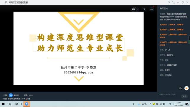 3月30日晚,必赢76net线路优秀员工、现执教于温州市第二中学的季悠然老师围绕“构建深度思维型课堂 助力师范生专业成长”这一主题,与公司2019级英语师范专业员工开展了线上经验分享与交流。讲座由学院教师吕飞飞主持。梁易老师和全体2019级师范生、学科教学英语研究生聆听了本次讲座。